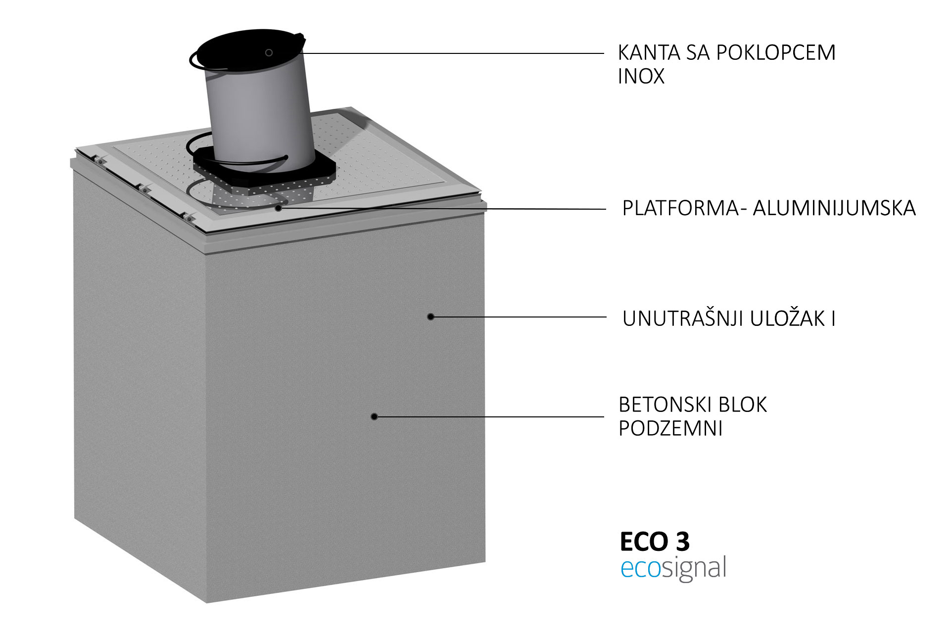 Podzemno betonsko kućište kontejnera je izrađeno kao monoblok od betona visoke klase čvrstoće – C45/55. Dimenzije betonskog kućišta u osnovi su 1850x1850 mm dok je visina 2280 mm.